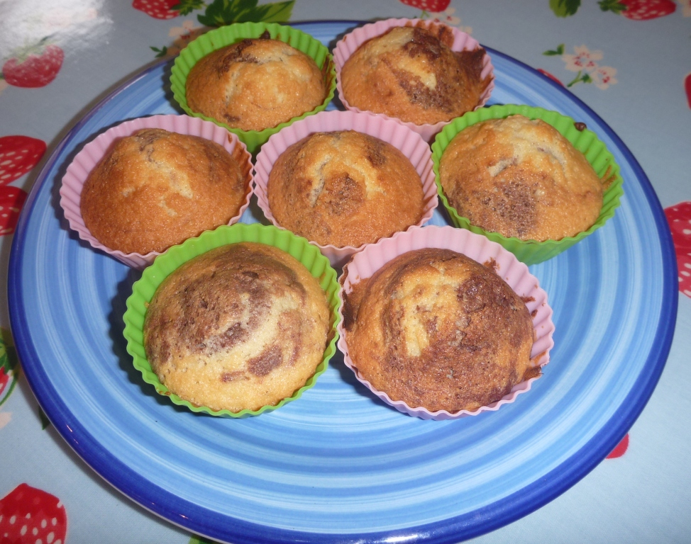 - Divide the mixture between 2 bowls. Add the melted chocolate (melt for 45 seconds in the microwave) & stir together until well mixed. Using a teaspoon alternatie the chocolate mixture with the plain mixture, put four teaspoons into each muffin case.