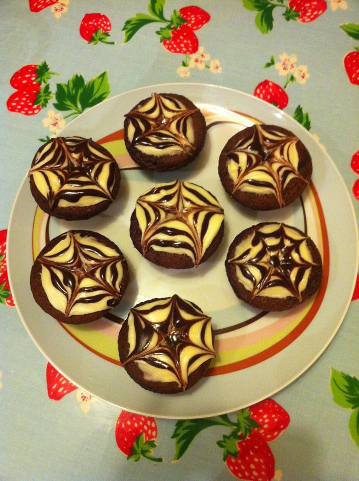 - Carefully pipe 2 or 3 circles onto each cupcake with a dot in the middle. Run a toothpick/cocktail stick from the centre to the edge of the cake through each circle of icing at 2cm intervals to create a cobweb effect.